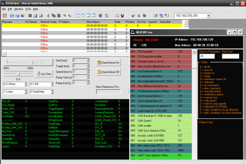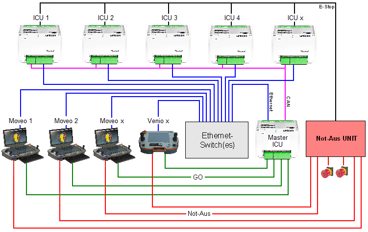 Der ICU ist eine voll integrierte Einheit, die speziell für die Steuerung von Theaterantrieben entwickelt wurde. Die Erkennung von Gruppenpositionen für synchrone Bewegungen wird direkt über das Netzwerk zwischen den ICUs geregelt, um den Engpass eines zentralen Sicherheitsrechners zu vermeiden. Einige Ein- und Ausgänge sind fest mit Funktionen belegt, wie z.B. Wartungsschalter, Umrichter bereit, Umrichter aktiv, Geber, Bremsen und dergleichen. Die anderen sind mit einem PC-basierten Konfigurationsprogramm namens ICU-Broker frei konfigurierbar. Alle Konfigurationsdaten werden in zwei Standard- und zwei gespiegelten EEPROMs in der ICU gespeichert. Die Daten bestehen aus Encoderauflösungsdaten, Netzwerkadresse, Antriebstyp, Endpositionen und IO-Konfigurationen für jeden Zustand, in dem sich der Antrieb befinden kann, was durch eine Zustandsmaschine in jeder CPU gesteuert wird. Der Computer, auf dem ICU Broker läuft, arbeitet innerhalb des Netzwerks und kann an jeden vorhandenen Switch angeschlossen werden. Auf Wunsch kann pro Antrieb eine Statusanzeige installiert werden, auf der u.a. der Zustand des Antriebs, der Ein- und Ausgänge etc. überwacht werden kann.